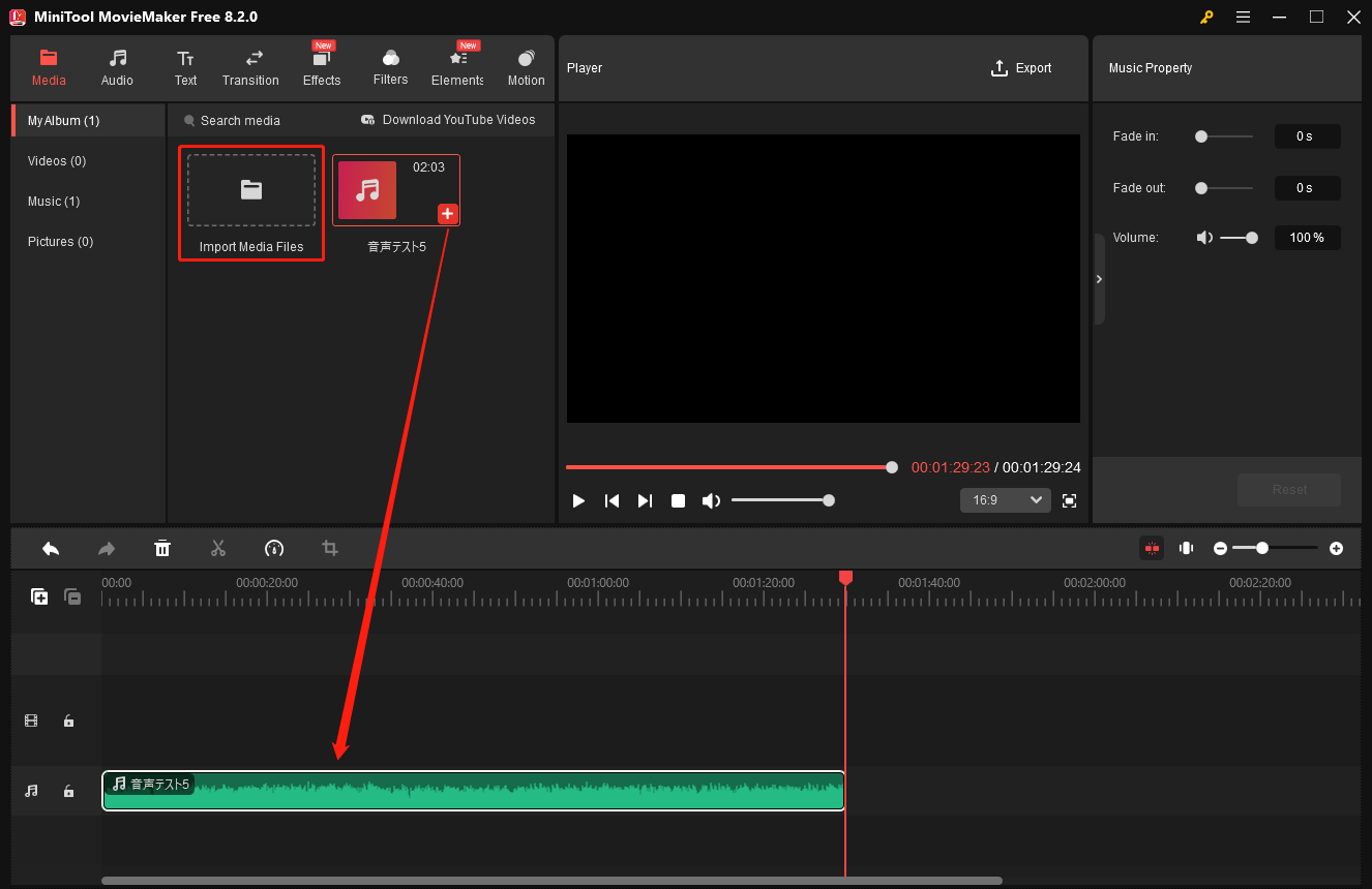 ステップ2. MiniTool MovieMakerを起動し、プロジェクトライブラリウィンドウを閉じてメインユーザインターフェースに入ります。「Import Media Files」ボタンをクリックしてオーディオファイルをインポートします。サポートされているオーディオファイル形式は WAV、MP3、M4A、M4R、FLAC、AAC、AMR、APE、MMF、WVです。次に、オーディオクリップ上のプラス(+)アイコンをクリックするか、タイムラインにドラッグ&ドロップします。