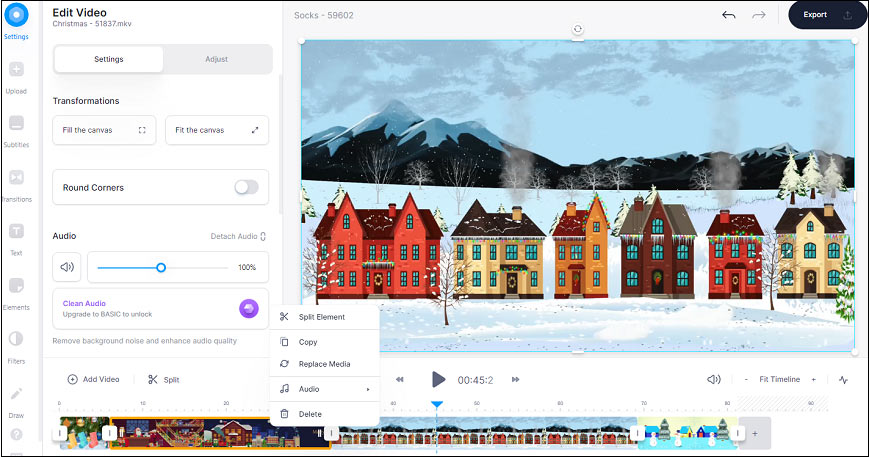 Step 3. Then the editor window opens. On the timeline, you can adjust the clip’s order and trim a video by moving the start point or the endpoint. Also, you can right-click a clip and select the Split Element to split a video into two parts, and then remove the unwanted section.