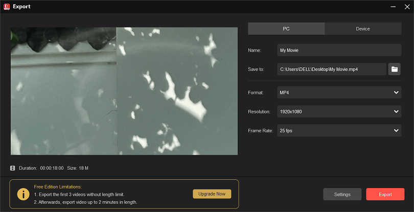 Finally, click the Export button located above the preview area to bring up the output settings window. From there, you can give the split video a name, choose where to save it, and change the video format, resolution, and frame rate.