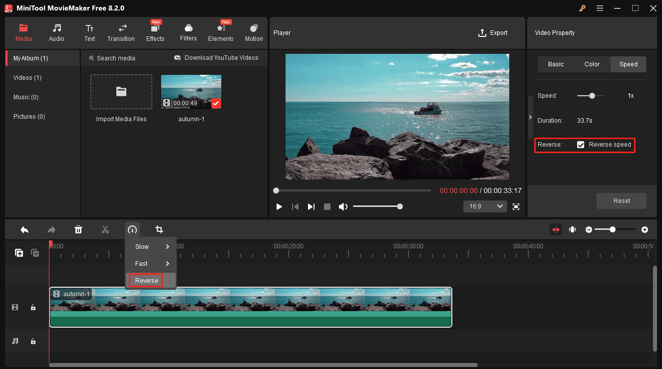 Step 3. Drag and drop the video to the timeline and select it. Click the Speed icon on the timeline toolbar and select Reverse. Alternatively, go to the Speed tab in Video Property and check the Reverse speed option.
